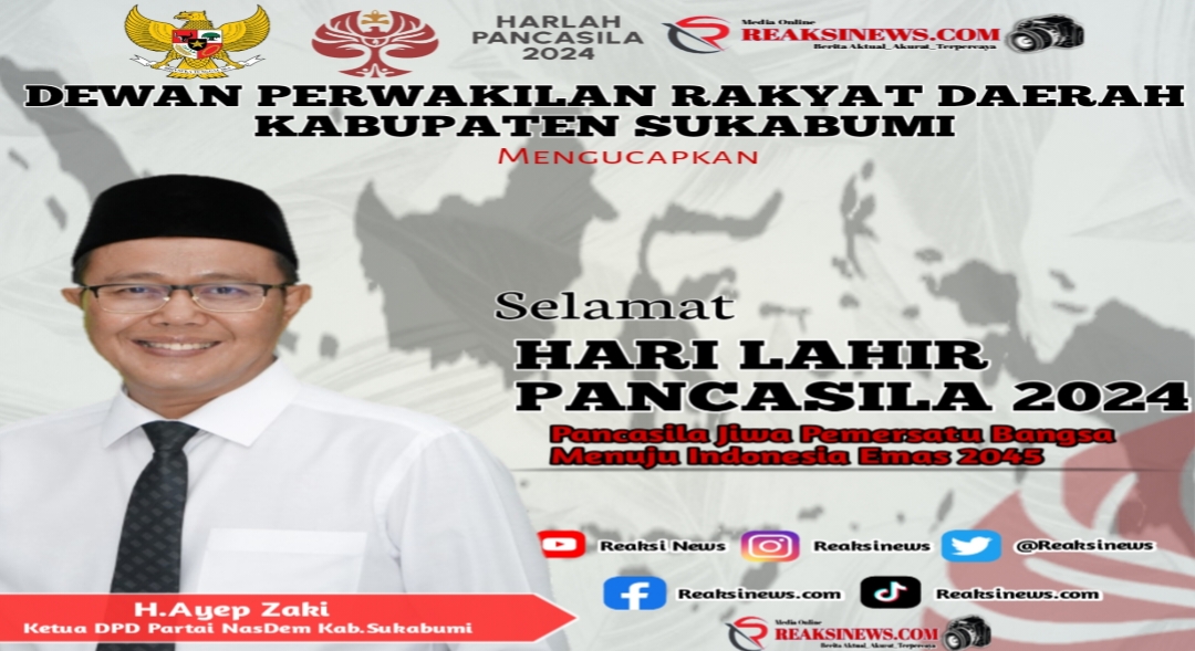 ReaksiNews.com || Pada kesempatan ini Ketua DPD Partai NasDem Kabupaten Sukabumi, H.Ayep Zaki beserta seluruh jajaran mengucapkan Selamat Hari Lahir Pancasila 1 Juni 1945 – 1 juni 2024.