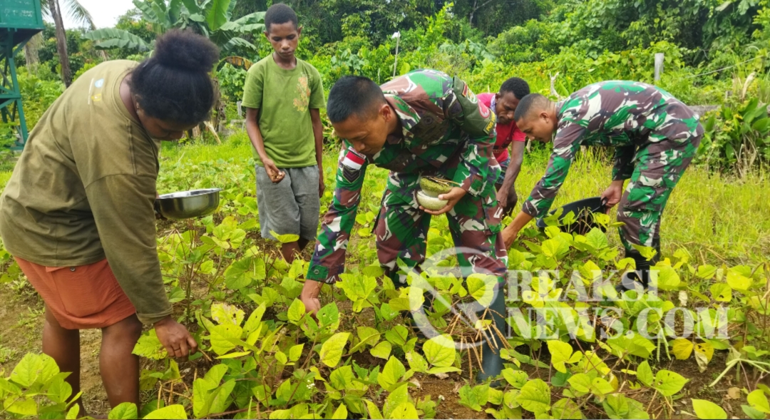 ReaksiNews.com || Keerom – Panen hasil kebun dari pemanfaatan lahan kosong di sekitaran Pos, Personil Satgas Yonif 310/KK yang berada di Pos Towe Hitam ajak warga panen kacang hijau di Kampung Towe Hitam, Distrik Towe, Kabupaten Keerom, Papua, Jumat (7/6/2024).