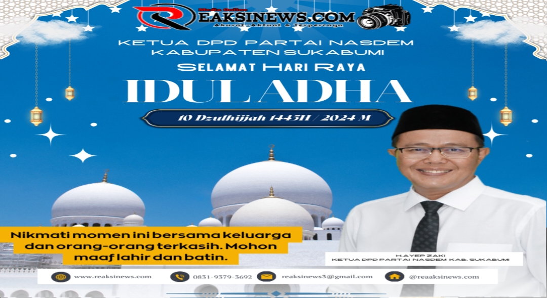 ReaksiNews.com || Ketua DPD Partai NasDem Kabupaten Sukabumi H.Ayep Zaki mengucapkan “Selamat Idul Adha 1445 H”. Arti pengorbanan adalah mendedikasikan apa yang ada di dunia ini untuk Allah SWT.