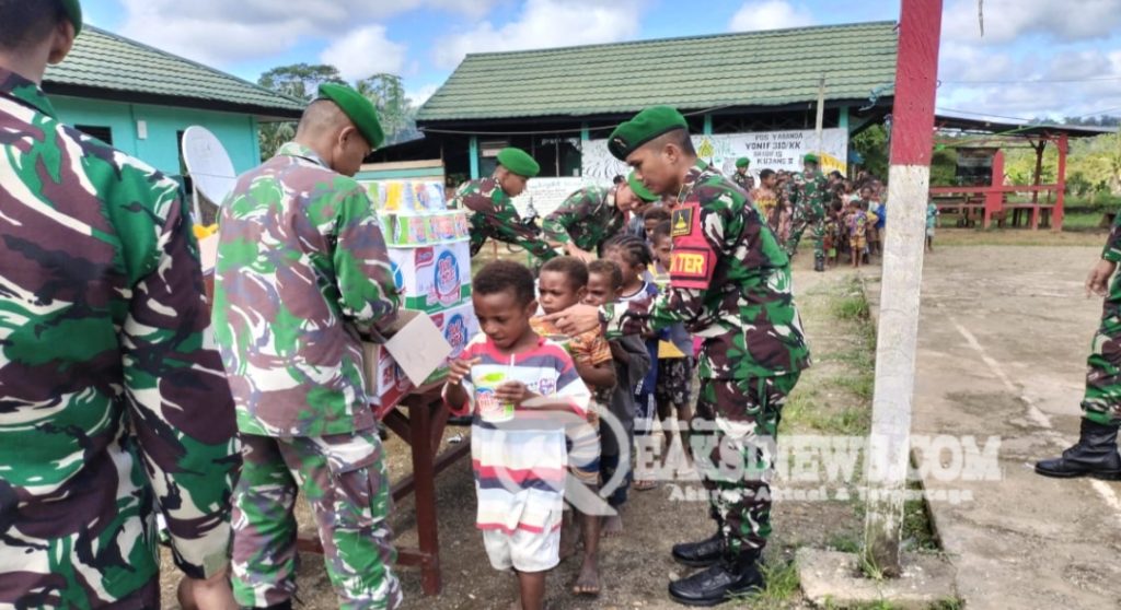 ReaksiNews.com || Keerom – Merayakan Hari Raya Idul Adha 10 Dzulhijjah 1445 H dengan sederhana di wilayah perbatasan RI-PNG, Pos Yabanda Satgas Yonif 310/KK mengundang warga khususnya anak-anak Papua untuk berbagi nikmat dan kebahagiaan dengan makan Pop Mie bersama di Kampung Yabanda, Distrik Yaffi, Kabupaten Keerom, Papua, Senin (17/6/2024).