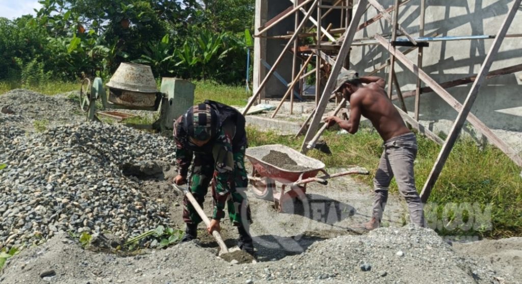 ReaksiNews.com || Keerom – Membantu mempercepat pembangunan gereja di perbatasan, personel Pos Senggi Satgas Yonif 310/KK bersama masyarakat bergotong royong membangun Gereja Alfa SP2 Soom Woslay di Kampung Woslay, Distrik Senggi, Kabupaten Keerom, Papua, Jumat (21/6/2024).