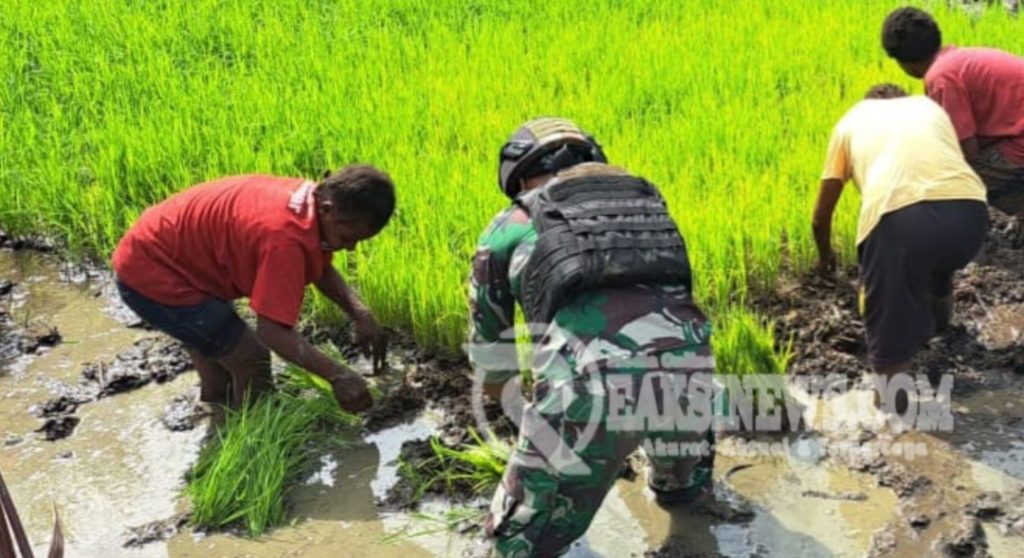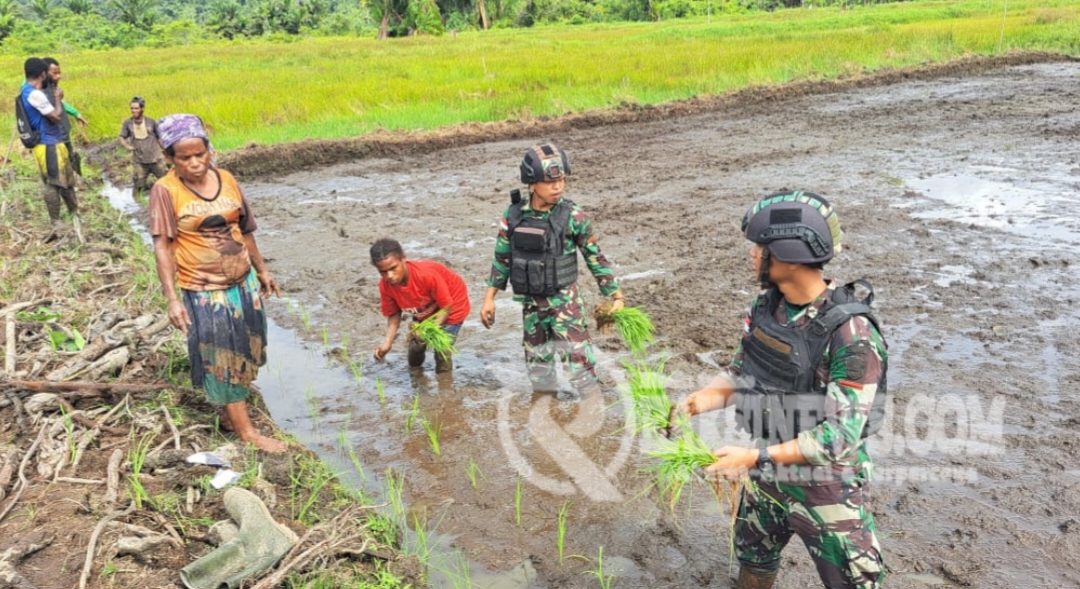 ReaksiNews.com || Pegunungan Bintang – Guna mendukung program ketahanan pangan di wilayah Papua, Pos Batom Satgas Yonif 310/KK membantu para petani menanam padi di Kampung Okyako, Distrik Batom, Kabupaten Pegunungan Bintang, Selasa (2/7/2024).