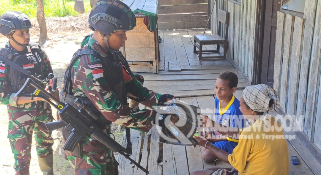 ReaksiNews.com || Pegunungan Bintang – Maung (Harimau) ikon yang identik dengan Prajurit Siliwangi, Pos Batom Satgas Yonif 310/KK lakukan anjangsana dan bagikan kaos bergambarkan Maung pada warga Kampung Batom 1 dan Batom 2 di Distrik Batom, Kabupaten Pegunungan Bintang, Papua, Jumat (12/7/2024).