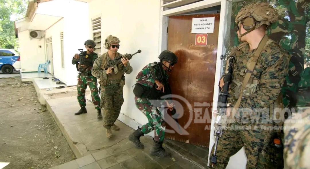ReaksiNews.com || Dispen Kormar (Situbondo). Dalam rangka Latihan Bersama (Latma) Platoon Exchange (PLATEX) 2024 antara TNI AL, KORMAR dengan USMC/I MEF, Prajurit Batalyon Infanteri 1 Marinir dan USMC melaksanakan latihan Close Quarter Battle (CQB) atau Close Quarters Combat (CQC) di Pusat Latihan Pertempuran (PLP) Marinir 5 Baluran, Karangtekok, Situbondo, Jawa Timur. Rabu (17/07/2024).