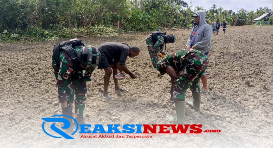 ReaksiNews.com || Keerom – Dalam rangka meningkatkan ketahanan pangan dan kemandirian ekonomi masyarakat di wilayah perbatasan, Pos Senggi Satgas Yonif 310/KK lakukan pendampingan di bidang pertanian bersama Poktan Sumber Rezeki Senggi dengan menanam bibit jagung di lahan seluas 1 Ha di Kampung Woslay SP2, Distrik Senggi, Kabupaten Keerom, Papua, Minggu (28/7/2024).