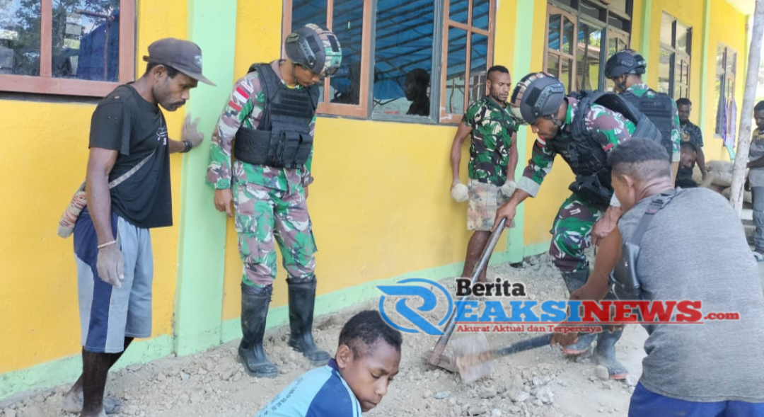 ReaksiNews.com || Keerom – Demi kenyamanan warga dalam beribadah, Pos Yabanda Satgas Yonif 310 /KK bersama warga sekitar bergotong royong melanjutkan pembangunan yang lama terhenti dengan memasangkan keramik lantai Gereja GKI Maranata di Kampung Yabanda, Distrik Yaffi, Kabupaten Keerom, Papua, Sabtu (3/8/2024).