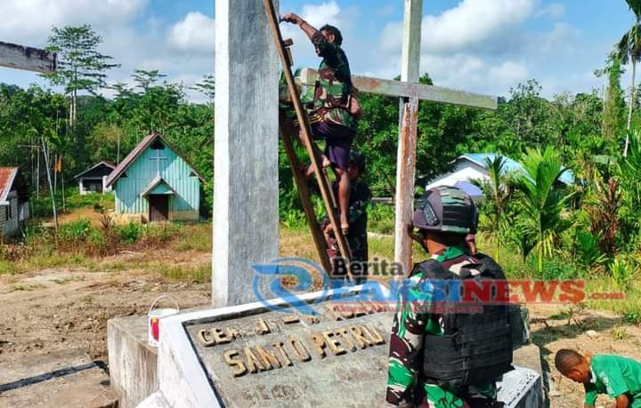 ReaksiNews.com || Keerom – Dalam rangka percantik dan perindah gereja, Pos Kalipao Satgas Yonif 310/KK bersama warga sekitar lakukan pengecatan dan pembersihan Tugu Salib Gereja Santo Petrus di Kampung Yuwainda, Distrik Waris, Kabupaten Keerom, Papua, Kamis (15/8/2024).
