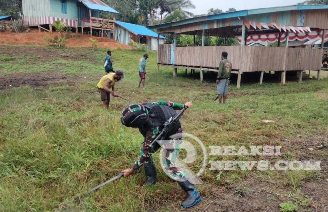 ReaksiNews.com || Keerom – Dalam rangka mewujudkan lingkungan yang bersih dan sehat, Pos Tatakra Satgas Pamtas Yonif 310/KK bersama warga sekitar melaksanakan karya bakti pembersihan Balai Kampung Tatakra di Distrik Web, Kabupaten Keerom, Papua, Selasa (17/9/2024).