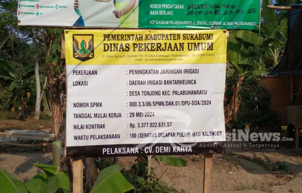 REAKSINEWS.COM || SUKABUMI – Pembangunan Peningkatan jaringan irigasi yang berlokasi Kp. Bantarheunca Desa Tonjong Kecamatan Pelabuhan Ratu kabupaten sukabumi dari Dinas Pekerjaan Umum, sumber dana dari APBD 2024 dengan nilai kontrak Rp.3.377.022.631,57 sebagai pelaksana CV. Demi Karya.
