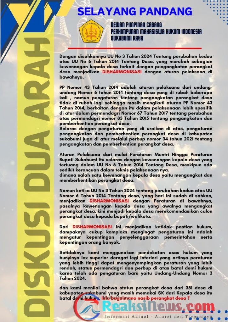 REAKSINEWS.COM || SUKABUMI – Persatuan Mahasiswa Hukum Indonesia (PERMAHI) Cabang Sukabumi menyatakan akan mengirimkan surat resmi kepada Dewan Perwakilan Rakyat Daerah (DPRD) Kabupaten Sukabumi. Langkah ini diambil setelah muncul dugaan adanya disharmonisasi dalam peraturan perundang-undangan di wilayah Kabupaten Sukabumi.
