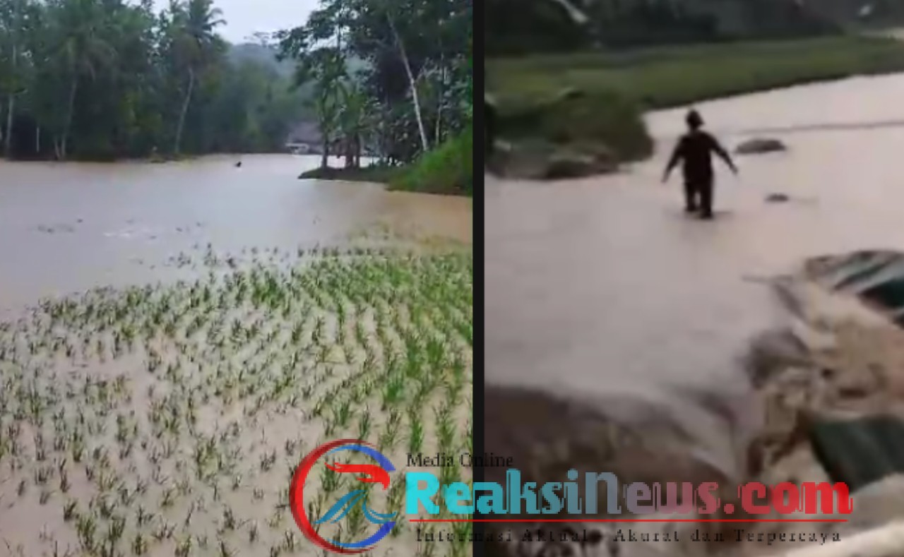REAKSINEWS.COM || Hujan deras yang mengguyur sebagian Daerah, mengakibatkan air sungai meluap serta puluhan hektar sawah dan rumah warga terendam banjir di Kp. Cigati – Kp. Pilar, Desa Sukamaju, Kec. Nyalindung, Kab. Sukabumi.