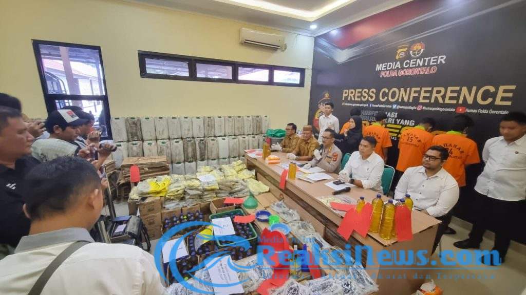 Reaksinews.com || Bahan paparan Press Reales bersama Bidhumas Polda Gorontalo sehubungan pengungkapan kasus penjualan minyak goreng (subsidi) dengan merek minyakita yang telah di oplos / salin kembali botol bekas air mineral ukuran 1500 ml, ukuran 600 ml dan Galon ukuran 22 liter untuk di perdagangkan.
