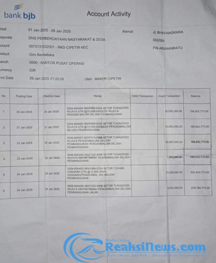 ReaksiNews.com || Sukabumi – Sebelumnya masyarakat menggelar aksi unjuk rasa, merupakan salah satu bentuk kekecewaan warga Desa Cipetir, terkait dugaan banyaknya penyelewengan anggaran dana desa tahun 2024, yang dilakukan oleh pemerintah Desa Cipetir pada pembangunan jalan desa yang diduga tidak memenuhi spesifikasi jalan.