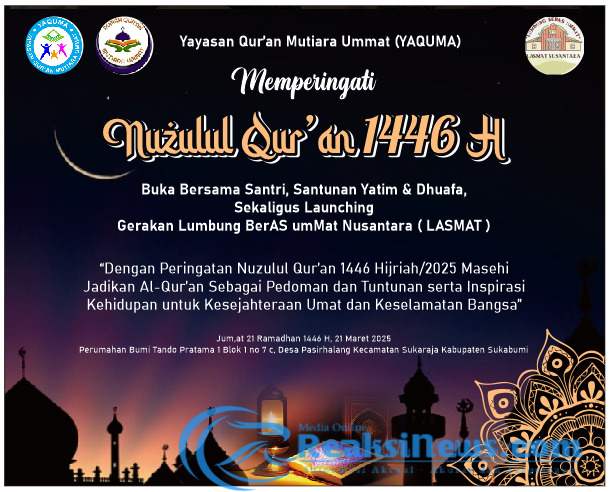 ReaksiNews.com || Sukabumi – Dalam rangka memperingati Malam Nuzulul Qur’an, Yayasan Quran Mutiara Ummat (YAQUMA) menggelar kegiatan Buka Bersama, Santunan Yatim dan Duafa Sekaligus Launching Gerakan Lumbung Beras Untuk Ummat (LaSMat Nusantara) Acara digelar di depan Sekertariat Yayasan Quran Mutiara Ummat, Perum Bumi Tando Pratama Sukaraja. Jum’at, (21/03/2025).