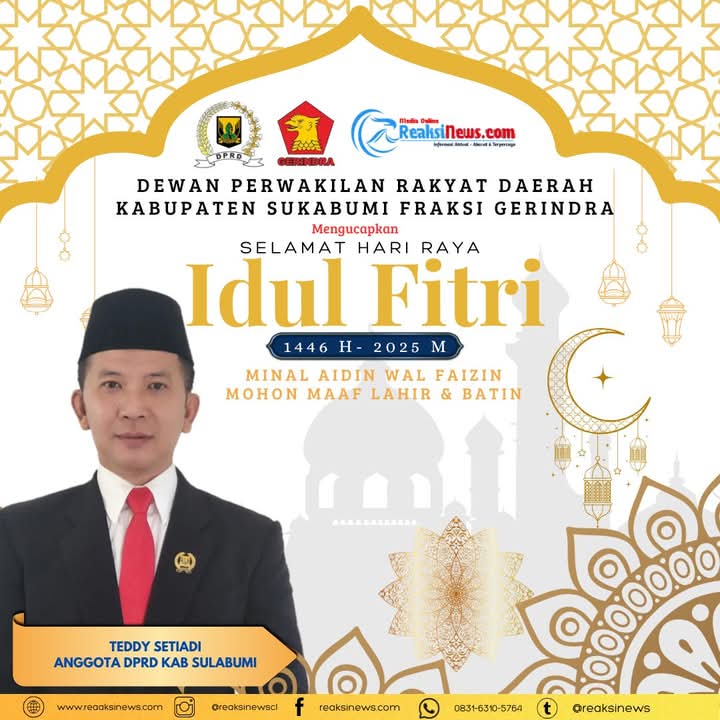 ReaksiNews.com || Sukabumi – Anggota DPRD Kabupaten Sukabumi dari Partai Gerindra Teddy Setiadi Mengucapakan Selamat Hari Raya Idul Fitri 1446 H.