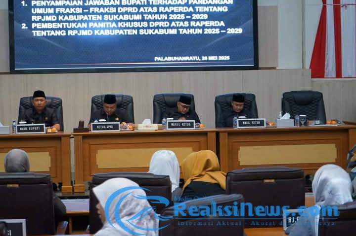 REAKSINEWS.COM || SUKABUMI – Bupati Sukabumi H Asep Japar menyampaikan jawaban atas pandangan umum fraksi-fraksi DPRD terhadap Rancangan Peraturan Daerah (Raperda) tentang Rencana Pembangunan Jangka Menengah Daerah (RPJMD) 2025-2029 dalam rapat paripurna yang digelar di ruang sidang DPRD Kabupaten Sukabumi, Senin (26/5/2025).