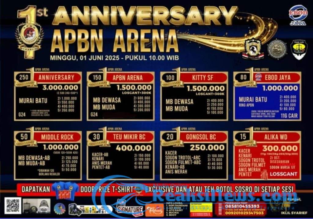 Lebih lanjut Syarif, kegiatan kita sangat di rindukan oleh para kicau mania hari ini gelaran Anniversary 1 tahun APBN Arena banjir Dorpres dan orang pertama hadir dapat kaoskrem Anniversarry APBN Arena sobener 10 orang pertama untu pembelian tiket mendapatkan takblosor.