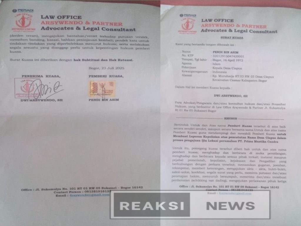 REAKSINEWS.COM || KABUPATEN BOGOR – ‎Kepala desa ciapus kecamatan Ciomas Pendi bin Asim bakal somasi pihak PT PMC dan pemerintahan kabupaten Bogor melalui law office arsywendo dan partner advocate dan legal consultant,pasalnya kejadian ini jelas sangat berdampak kurang baik karena telah mencatut nama desa Ciapus kecamatan Ciomas. (28/07/2025).