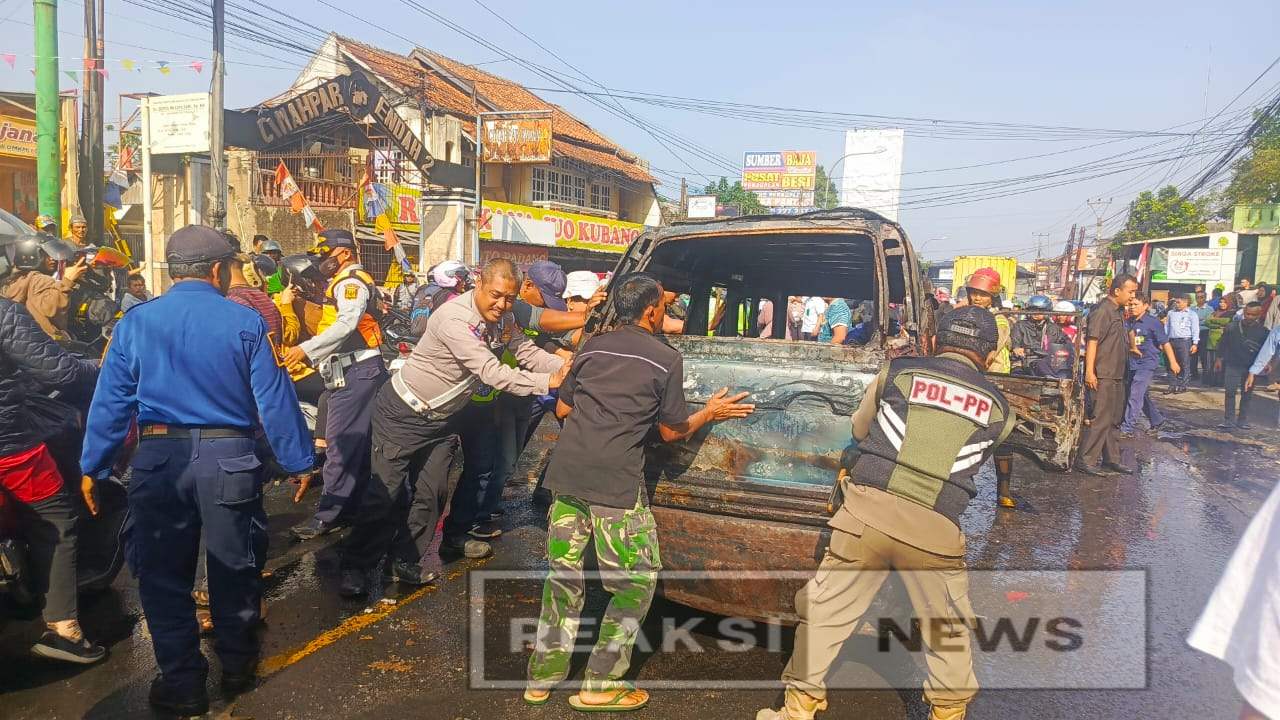 Tak lama setelahnya, terdengar suara ledakan yang disusul kobaran api membesar dan melalap seluruh bagian kendaraan.