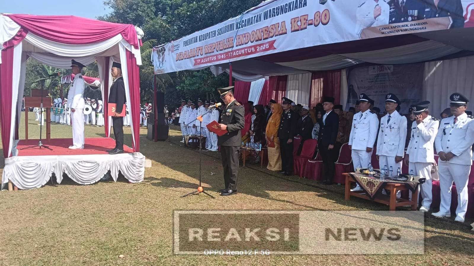 REAKSINEWS.COM || WARUNGKIARA – Danramil 2203/Warungkiara, Kapten Inf Agus Rahman, turut serta mengikuti Upacara Peringatan Hari Ulang Tahun ke-80 Republik Indonesia yang digelar di Lapangan Kecamatan Warungkiara, Sabtu (17/8/2025).