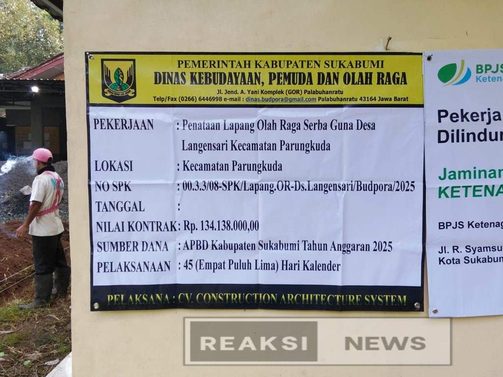 REAKSINEWS.COM || SUKABUMI – Pemerintah Kabupaten Sukabumi melalui Dinas Kebudayaan, Pemuda dan Olahraga (Disbudpora) tengah melaksanakan pembangunan penataan lapang olahraga serbaguna di Desa Langensari, Kecamatan Parungkuda. Proyek yang menelan anggaran sebesar Rp134.138.000 tersebut bersumber dari APBD Kabupaten Sukabumi Tahun Anggaran 2025.