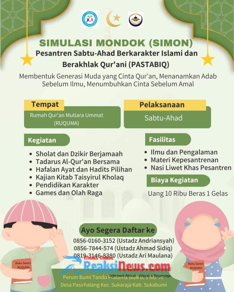 REAKSINEWS.COM || SUKABUMI – Dalam upaya menanamkan nilai-nilai Qur’ani dan membentuk karakter generasi muda yang berakhlak mulia, Yayasan Quran Mutiara Ummat mengadakan kegiatan Silaturahmi dan Sosialisasi Program Simulasi Mondok (SIMON), bertempat di Mushola Nurul Iman RT 01/RW 13. Sabtu, (11/10/2025)