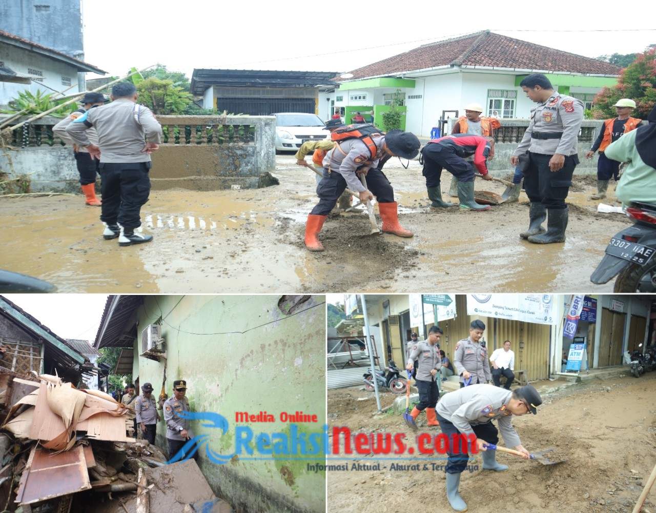 Tak hanya membantu mengevakuasi warga, polisi juga turut membersihkan lumpur dari rumah warga dan jalan akibat banjir yang terjadi.