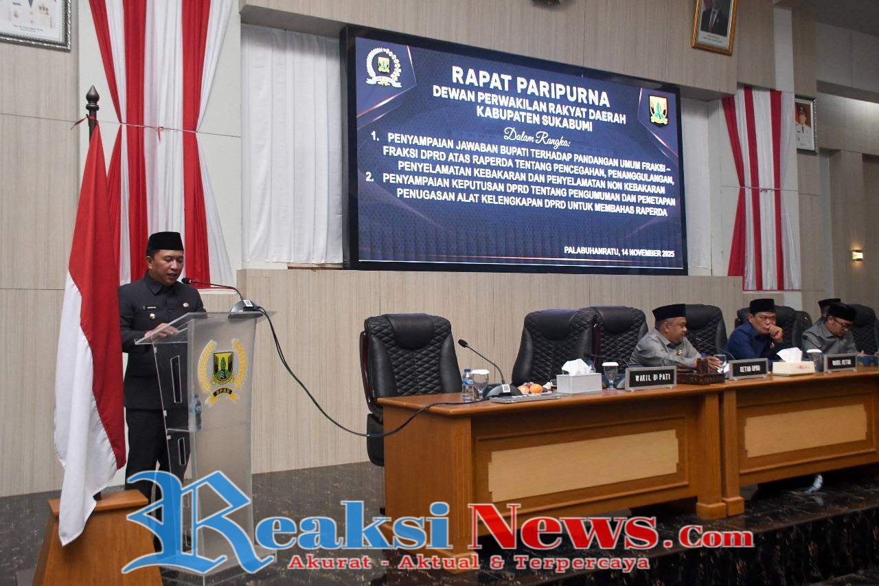 REAKSINEWS.COM || SUKABUMI – DPRD Kabupaten Sukabumi menggelar rapat paripurna dengan agenda penyampaian jawaban Bupati terhadap pandangan umum fraksi-fraksi atas Rancangan Peraturan Daerah (Raperda) tentang Pencegahan, Penanggulangan, dan Penyelamatan Kebakaran serta Penyelamatan Non Kebakaran, di Ruang Rapat Paripurna DPRD, Jumat (14/11/2025).
