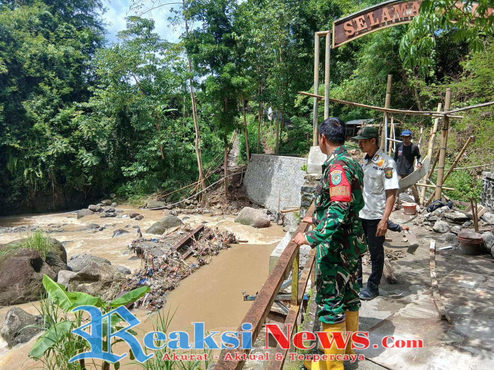 REAKSINEWS.COM || SUKABUMI — Babinsa Desa Tarisi, Serka Dodi dari Koramil 2203/Warungkiara, melakukan peninjauan langsung ke lokasi jembatan penghubung sementara antara Desa Tarisi dan Kecamatan Bantargadung yang terdampak luapan air sungai, Sabtu (22/11/2025).