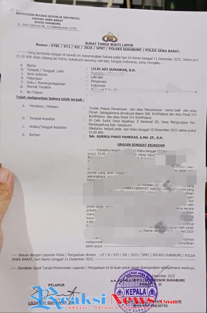 Kami sebagai Kuasa Hukum Kalapas Kelas II A Warungkiara telah mendatangi SPKT Polres Sukabumi Polda Jabar dan melaporkan RH (33) Warga Kampung Cilimus Tarisi Warungkiara dan telah menerima Surat Tanda Bukti Lapor Nomor :STB/672/XIi/2025/SPKT/POLRES, SUKABUMI/POLDA JAWA BARAT, Sesuai dengan Laporan Polisi /Pengaduan Nomor:LP/B/672/XII/2025/SPKT/POLRES, SUKABUMI/POLDA JAWA BARAT pada hari Kamis tanggal 11 Desember 2025.