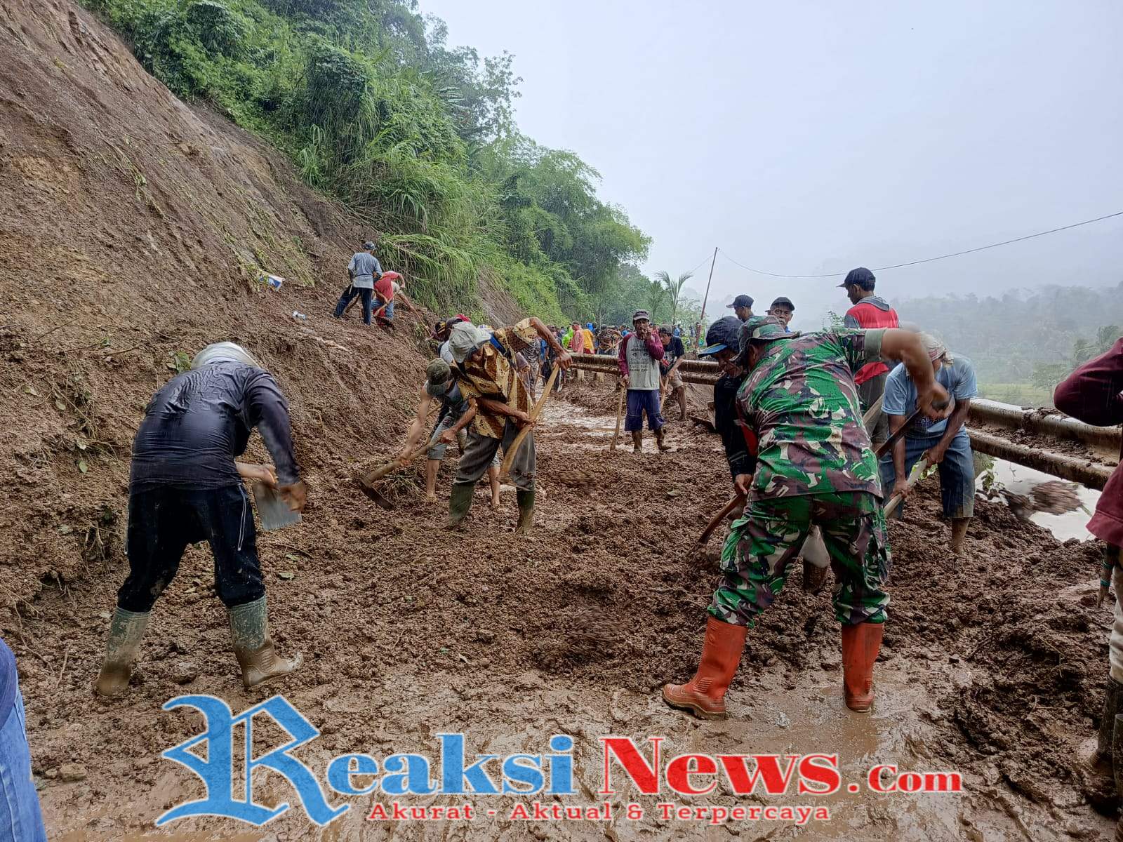 REAKSINEWS.COM || SUKABUMI – Babinsa Desa Bantarkalong, Sertu H. Agus Ramdani Koramil 2203/Warungkiara bersama warga setempat melaksanakan kegiatan pembersihan material longsor yang menutup ruas jalan di sekitar Jembatan Cilalay, Desa Bantarkalong, Kabupaten Sukabumi, Jawa Barat, Rabu (17/12/2025).