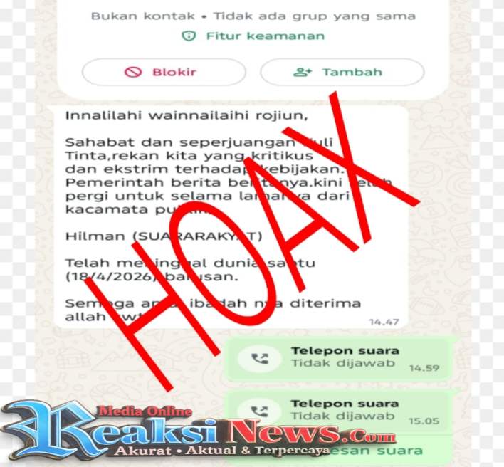 REAKSINEWS.COM || SUKABUMI — Beredarnya kabar yang menyebutkan Hilman Suararakyat meninggal dunia pada Sabtu, 18 April 2026, dipastikan tidak benar atau hoaks. Informasi tersebut diketahui menyebar luas melalui pesan berantai di aplikasi WhatsApp, yang dikirim dari nomor tidak dikenal, yakni 0895 1817 3587.