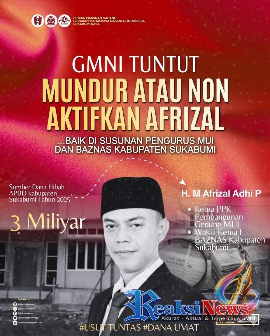 Sebabnya telanjang: Afrizal yang juga Ketua PPK pembangunan Gedung MUI Kabupaten Sukabumi kini disorot karena proyek gedung MUI dinilai mangkrak padahal dana hibah sudah cair. GMNI menilai ada konflik kepentingan akut yang mengancam marwah BAZNAS.